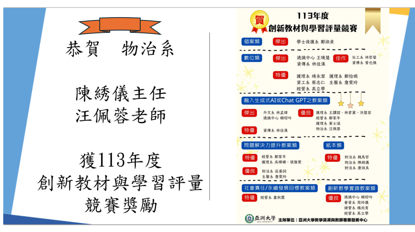 【學系公告】校園新聞公告-亞大物治系國考成績優異,囊括第1、2名
